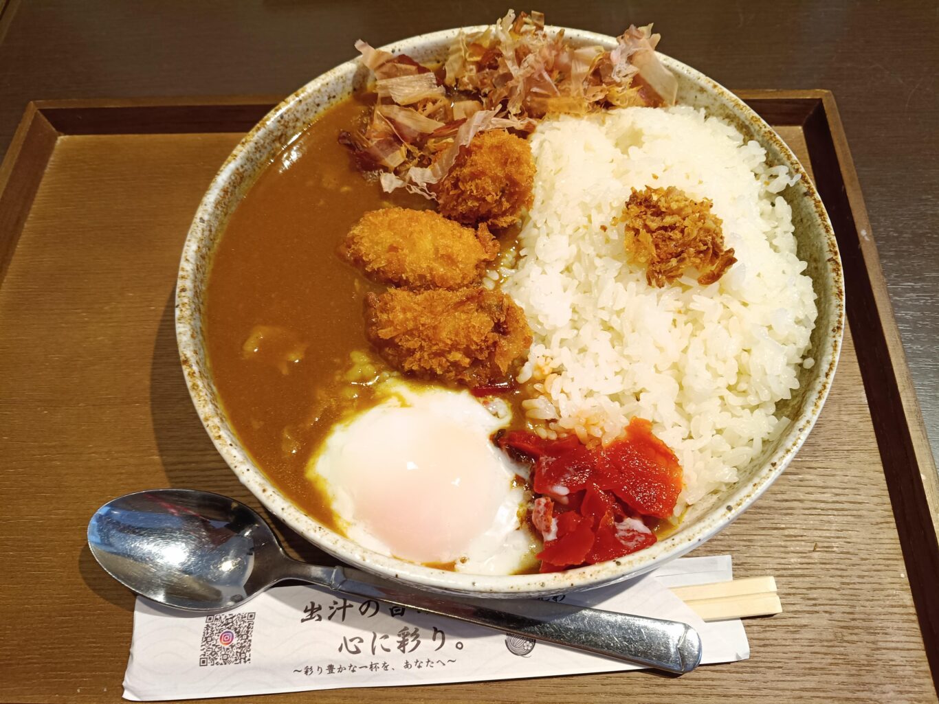 白米の白、カレーの茶色、そしてその上に鎮座する揚げ物の茶色。
