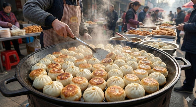 どんな料理?: 朝市や屋台で大人気の香ばしい焼き包子(肉まん)。
