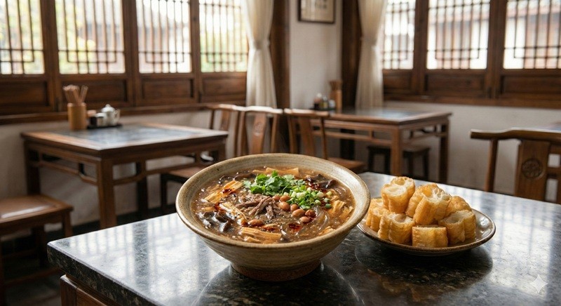 牛肉や湯葉、野菜などがたっぷり入っています。上記で紹介した「水煎包」や油条(揚げパン)をスープに浸しながら食べるのが、地元民が愛する王道の朝食スタイルです。