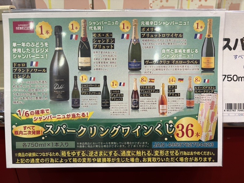 売値は2500円~5500円、ワインやウイスキー等が当たります。その時々で内容が変わるのも飽きない要因です。